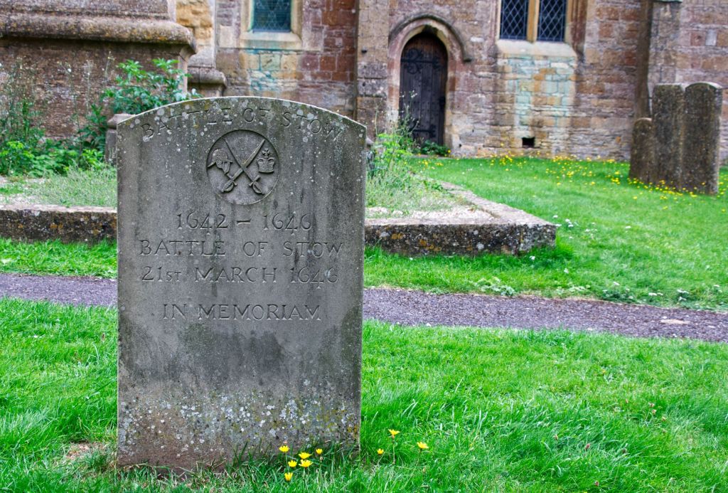 In the churchyard, there is a small headstone dedicated to those who fought in the English Civil War, 1642-1646. The Battle of Stow, 21 March 1646, was the last pitched battle of the war in England. The defeat of the Royalist forces in the battle sealed the fate of Charles the First who was under siege in nearby Oxford. With the defeat of the Royalists’ forces at Stow, Charles’ last hope was gone and in May he surrendered. Britain has many First and Second World War and even Boer War memorials but few memorials to the 17th Century Civil War. This is one of the few.