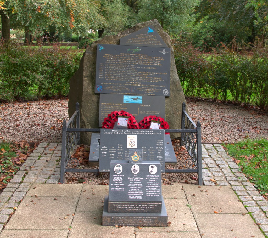 Alongside the avenue is a moving memorial to Athur Hutt, a Coventry born serviceman who was awarded the Victoria Cross. A few metres further on there is a memorial to the men and women of the WW2 airborne services. Trees throughout the park are dedicated to individual service men and women who died for their country. Plaques at the base of the trees commemorate their deaths. At the north end of the park are the concrete remains of a barrage balloon station. These barage balloons were used to protect the city against enemy air attack. Sadly, they did not prevent the city suffering from severe enemy air attacks in WW2.
